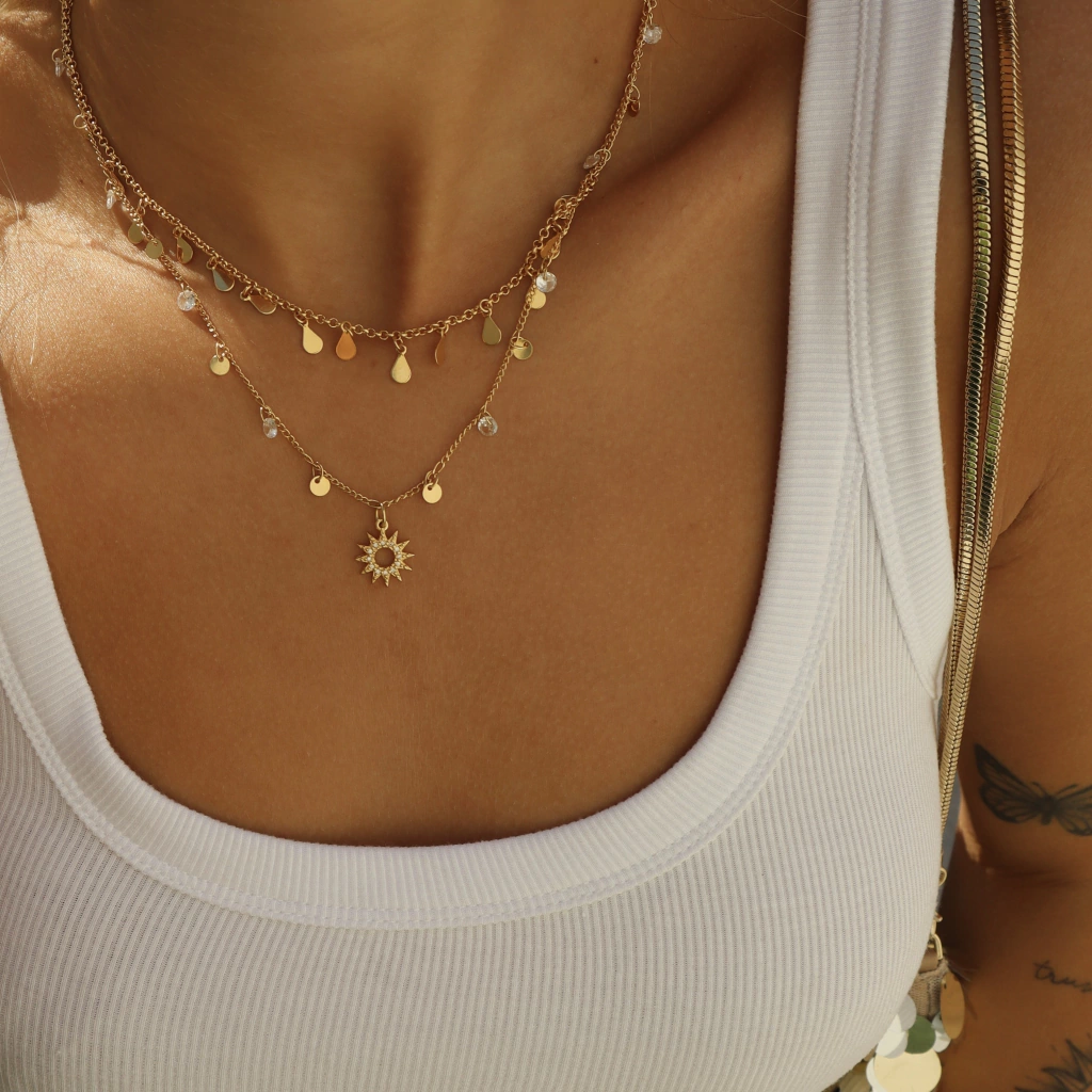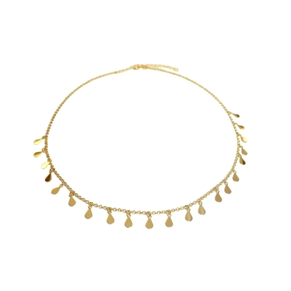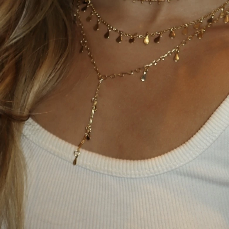 O colar gotinhas, possui pequenas gotas aderidas por sua extensão transmitindo um toque único e podendo ser utilizada para compor mixes ou sozinha! A peça ideal para qualquer porta jóias!